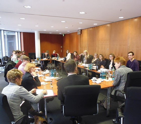 Studentinnen und Studenten für Journalismus von der Johannes-Gutenberg-Uni Mainz besuchten heute den Bundestag und sprachen mit Petra Pau. Themen waren u. a. die bislang nicht garantierten Rechte der kleinen Oppositionsparteien, Übergangsregelungen und Karenzzeiten für scheidende Politiker, die Finanzierung von Parteien, inklusive Spenden und Sponsoring.