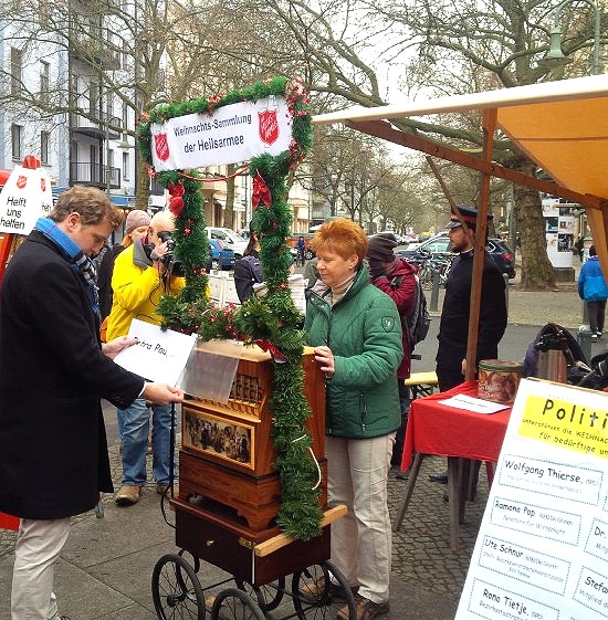 Auch dieses Jahr will die Heilsarmee am Heiligen Abend wieder eine Weihnachtsfeier für Obdachlose im Hotel Arte-Maritim anbieten. Dafür wurden heute von den Marktkunden auf dem Kollwitz-Platz in Prenzlauer Berg wieder Spenden erbeten. Als Aufmerker wurde von bekannten Berlinerinnen und Berlinern eine Orgel gedreht. Auch Petra Pau gehörte zu ihnen.
